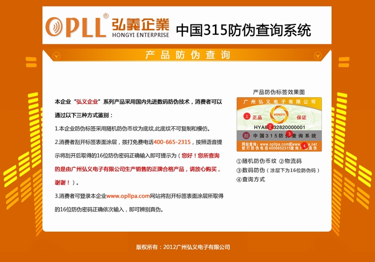 为有效保护广大客户和用户的利益,打击市场上针对OPLL(欧派)广播会议系列产品的假冒行为,防止串货,假货,我司特对此采取防伪措施,所有我司出厂正品均有防伪标识,请广大客户认准后购买!